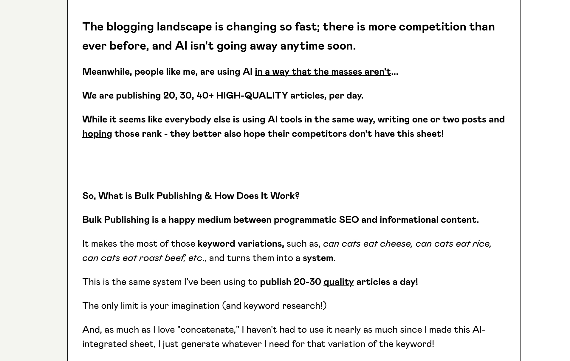 Ross Simmonds recently published a blog post in praise of AI (which this essay was actually originally written in response to). I was particularly struck by Ross's praise of this ChatGPT-based "Bulk Publishing System" by Arielle Phoenix.