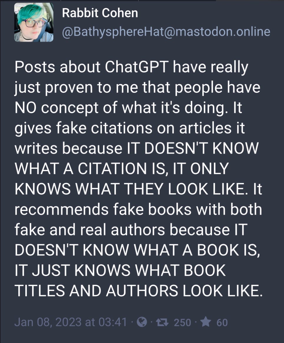 "But while its output is entertaining, sometimes funny, and fluent — convincingly so — it is also unreliable, generating responses that can be spectacularly wrong. In an information environment in which trust is extremely low and mis- and disinformation are rampant, ChatGPT’s parlor trick of human mimicry pours gas on an already flaming dumpster fire."